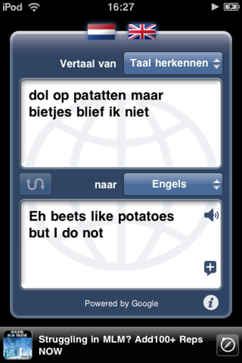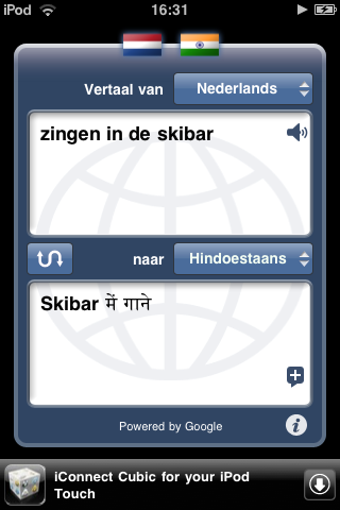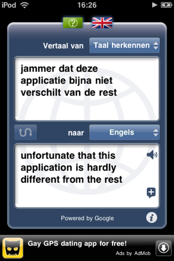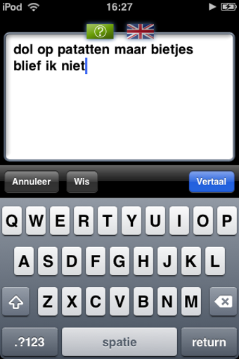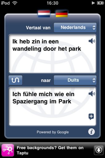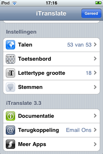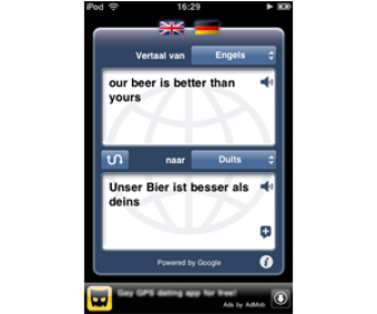 Net als Vertaler Pro haalt iTranslate de antwoorden van het internet. Applicaties als deze verkies je boven de vertaaloptie in de Google Mobile App, omdat je hier vanuit één applicatie vertalingen ophaalt. Het scherm bestaat grotendeels uit het in- en uitvoerveld en met keuzemenu's wissel je van taal. Ook wissel je met één knop de talen om, zodat je snel schakelt tussen bron- en doel-taal.